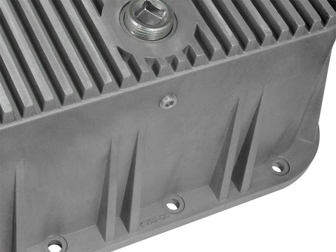 aFe Powers new deep transmission pan brings performance engineering to the protection of your trucks transmission. This transmission pan has additional capacity for 3 to 4 more quarts over stock at the factory line, a magnetic drain plug and a 1/8" NPT port for your temperature sensor. Built-in internal and external fins transfer heat from the fluid to the outside air for maximum cooling. T his transmission pan is constructed out of durable die-cast A380 aluminum with reinforced ribs and a wrinkle black powder-coating for maximum strength and styling.