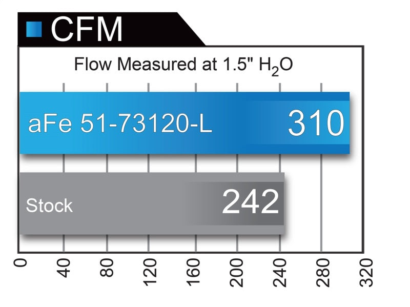 This intake system utilizes oil-free, large 7" tall conical 360 degree radial flow performance air filter with 3-Layer progressively finer porosity synthetic media for maximum convenience. The smooth one-piece sealed housing is used to eliminate the use of multiple-piece housings and ensure the coolest air intake charge available. A large, clear sight window is used for a hassle-free filter inspection and an aggressive style. Dual mandrel-bent powder-coated wrinkle-black aluminum equal length intake tubes are designed with an H-pipe to balance intake tube pressure and maximizes airflow and velocity. Also included, an exclusive black riveted aFe Power badge. This is a direct bolt-on kit that requires no cutting or drilling on factory parts.